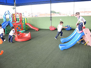 A Psicomotricidade é trabalhada com uma sequência de atividades que integram o movimento do corpo com o desenvolvimento cognitivo. As aulas são adequadas para cada idade e focam em desafios executáveis, que fortalecem a conexão entre corpo e mente. Em cada aula, os alunos utilizam diferentes espaços e materiais como bolas, cordas e cones. As atividades são preparadas de forma lúdica, permitindo que a criança explore suas capacidades de movimento, coordenação e equilíbrio, reforçando o “brincar” como principal forma de aprendizado.